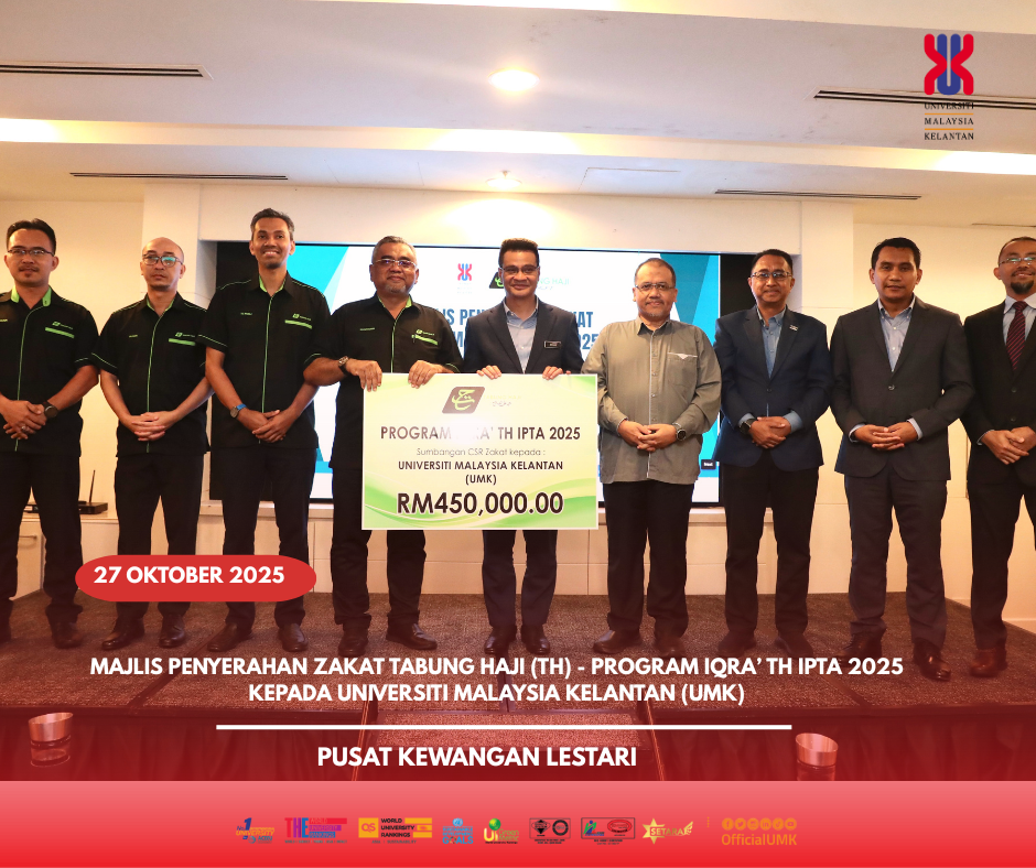 Universiti Malaysia Kelantan received a corporate zakat contribution totaling RM450,000 from Lembaga Tabung Haji through the Iqra’ TH IPTA 2025 Program at a ceremony held at Hotel Perdana, Kota Bharu.